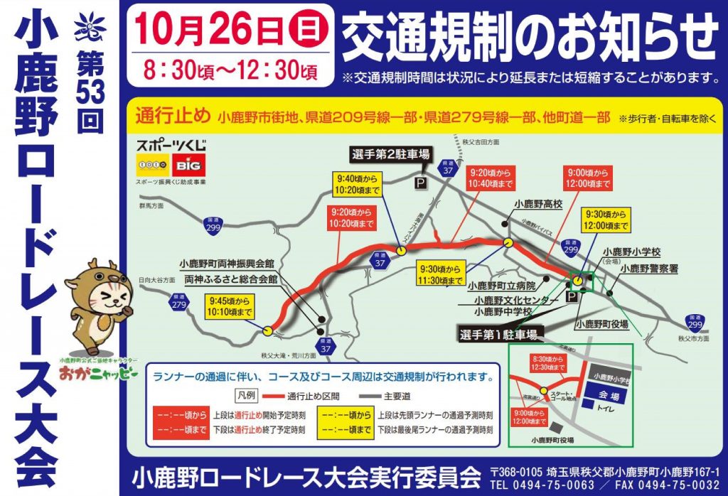 小鹿野ロードレース大会開催のため、10月26日(日)の午前中、下記のとおり通行止めが予定されています。