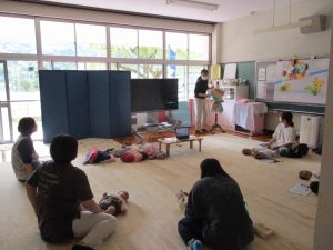 どのように抱っこしたらよいかを教えてくれる、ベビーラップアドバイザーで助産師のくぼみほさんが、講話やスリング体験、お持ちの抱っこ紐の調節等を行い、今回は4名のママがお子さんと一緒に参加されました。