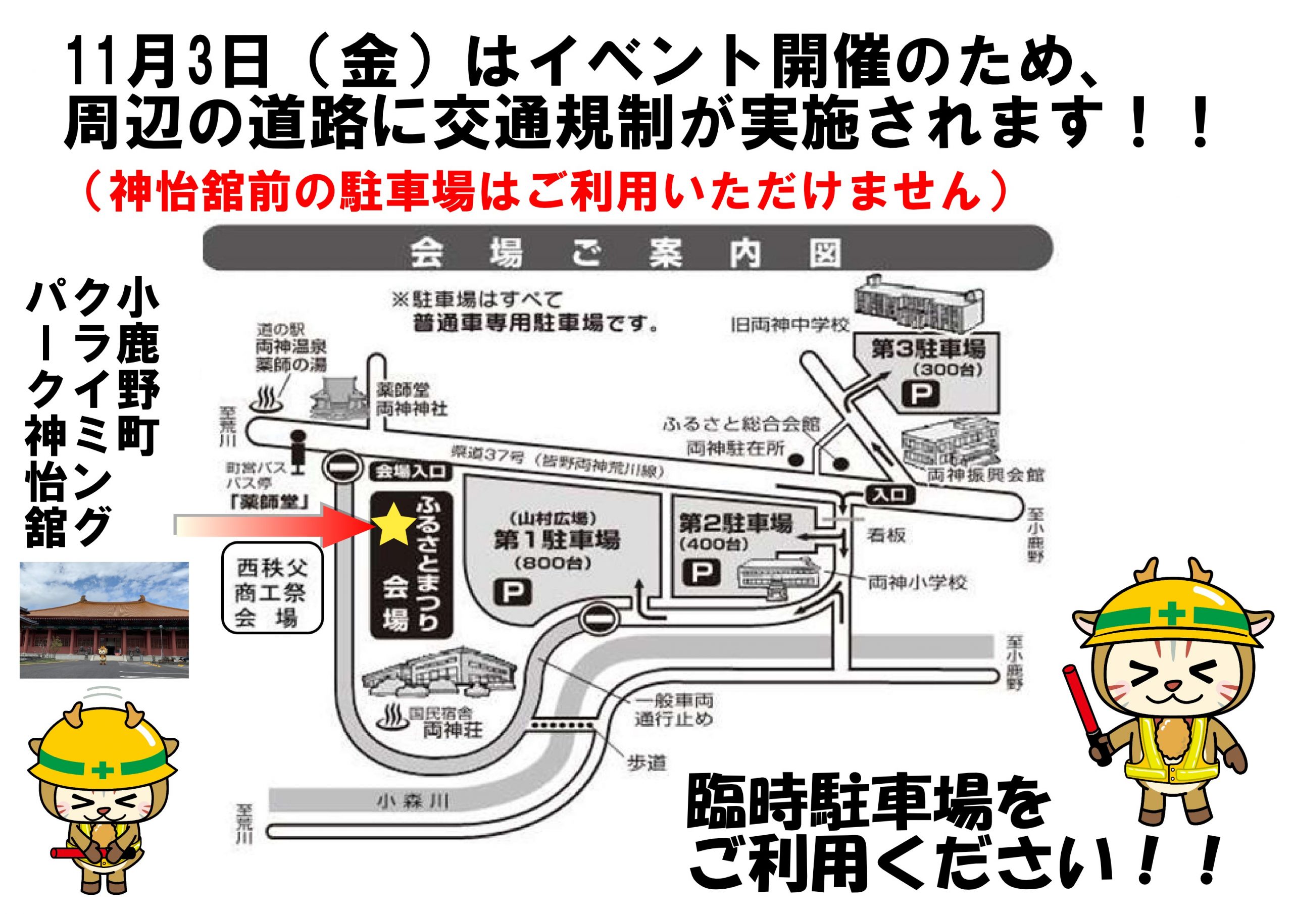 令和5年11月3日(金)は、「第47回小鹿野町両神ふるさとまつり」が開催されます。 イベント開催に伴い神怡舘周辺道路への交通規制が実施されるため、当日は神怡舘前の駐車場をご利用いただくことができません。神怡舘をご利用の皆様におかれましては、ご不便をおかけして申し訳ございませんが、臨時駐車場へお車等を停めていただきますよう、お願いいたします。 また、当日は混雑することが予想されるため、見学のみの方の入館を制限させていただきます。