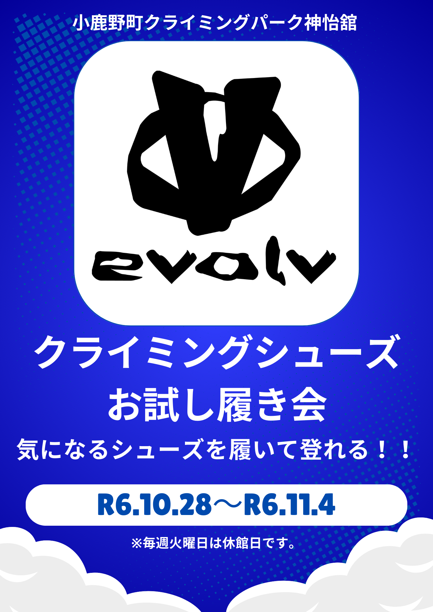 10月28日(月)から11月4日(月)までの間、「evolv」様のクライミングシューズを履いて壁を登ることができます。【29日(火)は休館日】