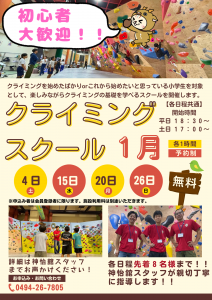 クライミングスキルを学べるスクールを開催します。1月の開催日程につきましては、下記のチラシのとおりです。