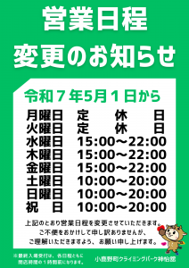 令和7年5月1日から小鹿野町クライミングパーク神怡舘の営業日程を下記のとおり変更させていただきます。