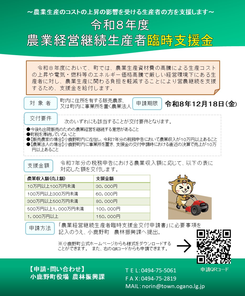 ・(個人の場合)小鹿野町内に在住し、令和7年分の税務申告において農業収入が10万円以上あること