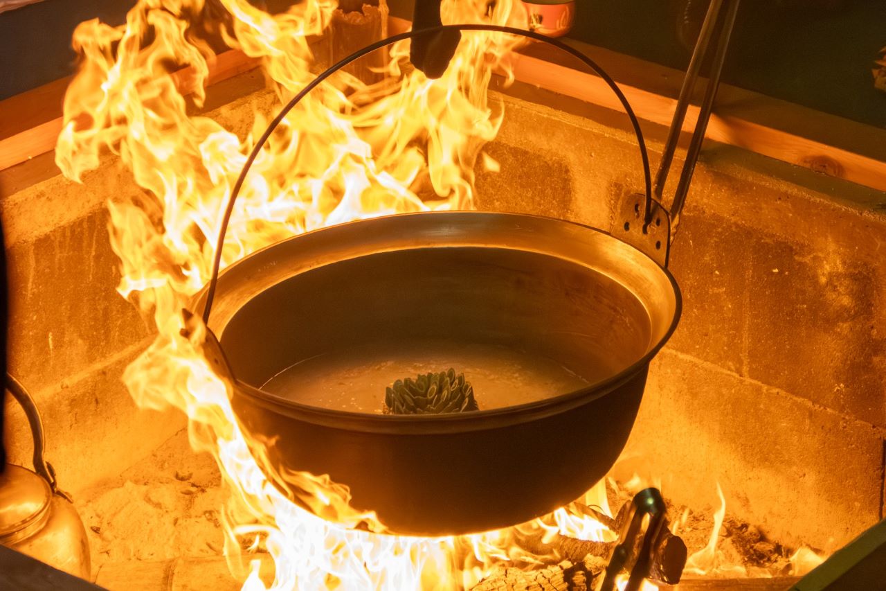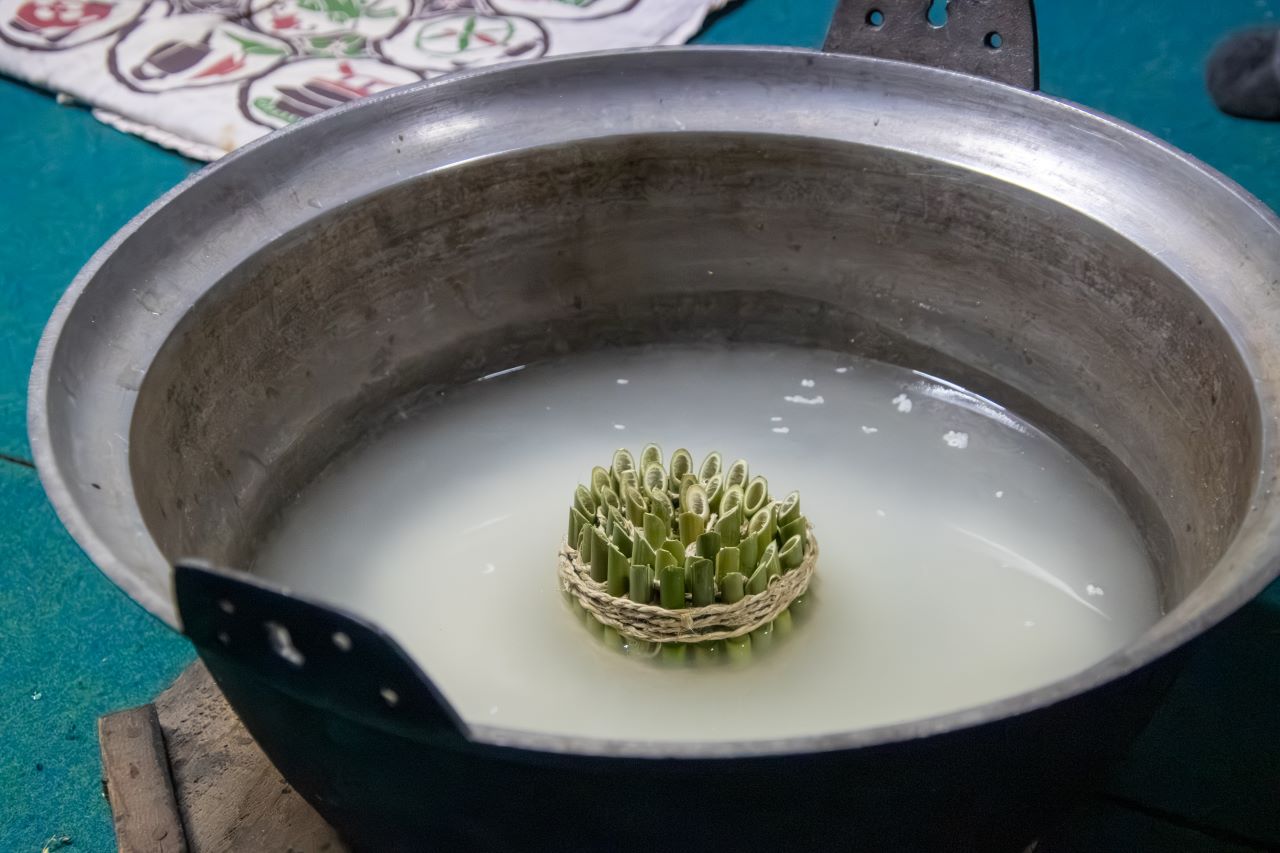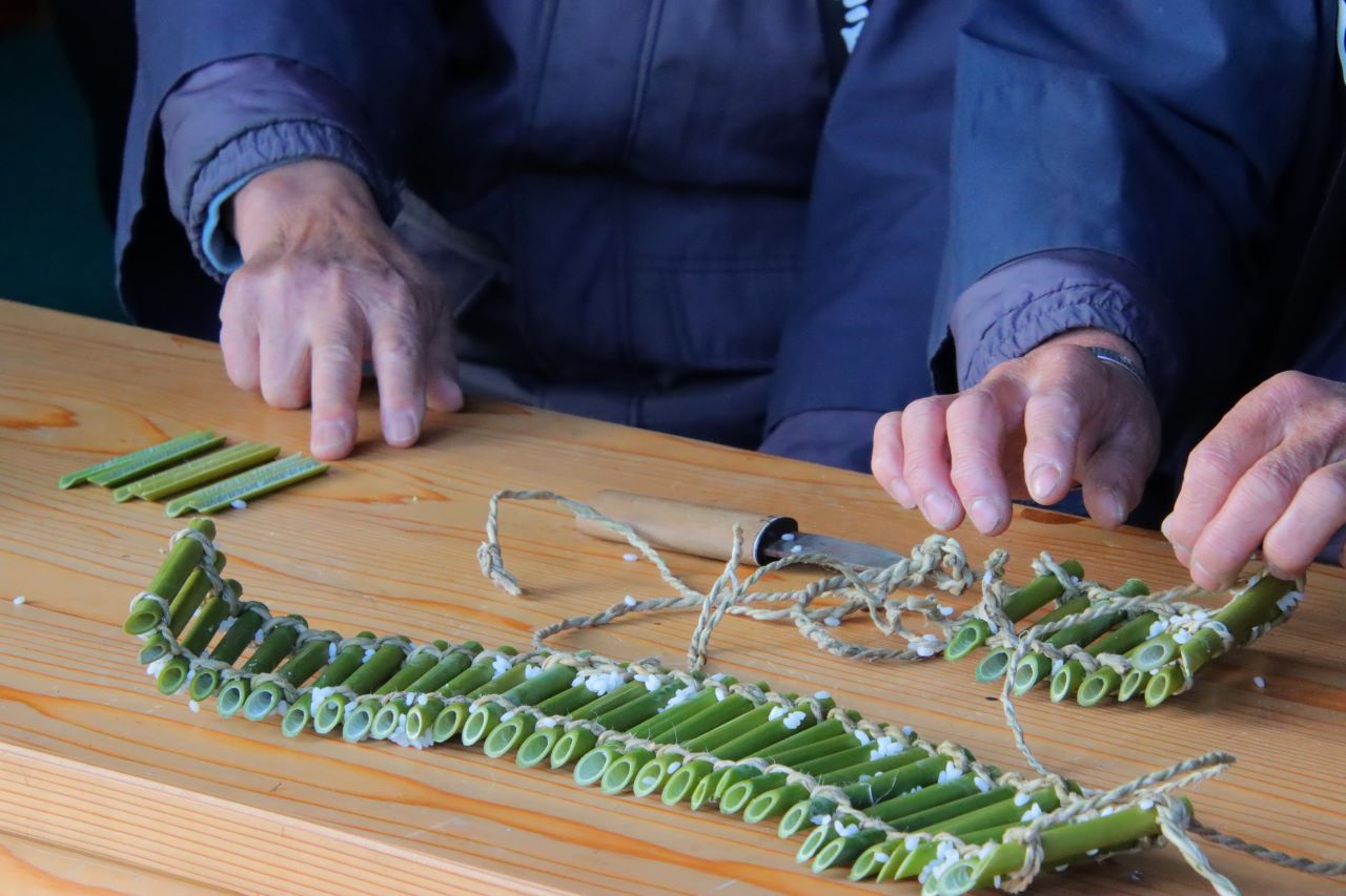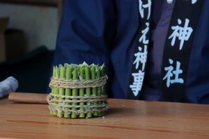 14日の夜に篠竹を45本簾編みに巻いたものをおかゆと一緒に炊き上げ神前に供え、15日朝に管を割り言い伝えと経験をもとに1年間の天候、30種の作柄、雨、風、大世(社会情勢等)を占います。