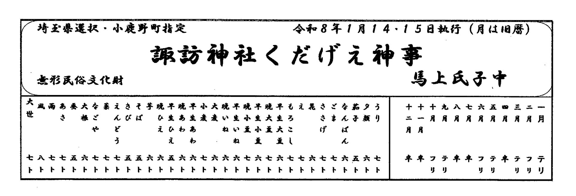 粥を使った占い行事は、三峯神社(秩父市大滝)や金鑚神社(神川町)などでも行われており、多くは神社内で神職が占うもので、馬上のように耕地の人々によって行われるのは貴重な例だと言われています。