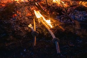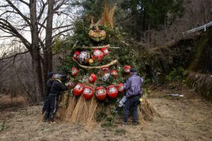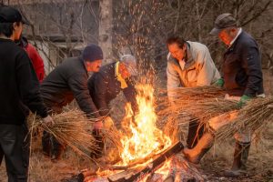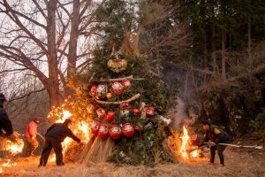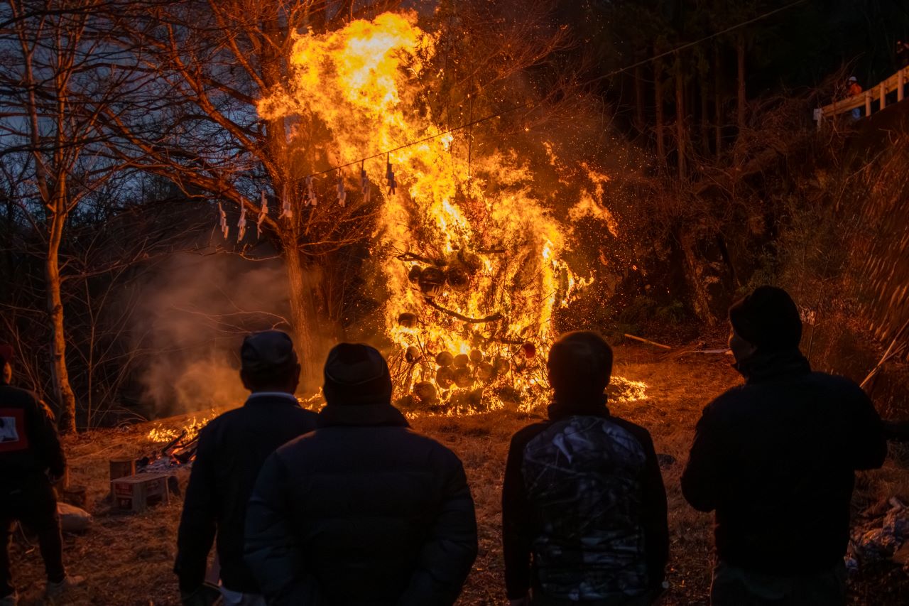 小鹿野町河原沢の橋詰地内で小正月の火祭り行事である、「橋詰のドウロク神焼き(県指定無形民俗文化財)」が行われ、ヒノキや竹、正月飾りなどで作られた社を燃やし、火難よけを祈願しました。 この地域では、ドウロク神の炎で付けたタバコを喫む(のむ)と一年が健康でいられるとの言い伝えがあり、オッカゾ(栲)の木で作った脇差を焦がし、各家の戸口に飾り魔除けとしています。