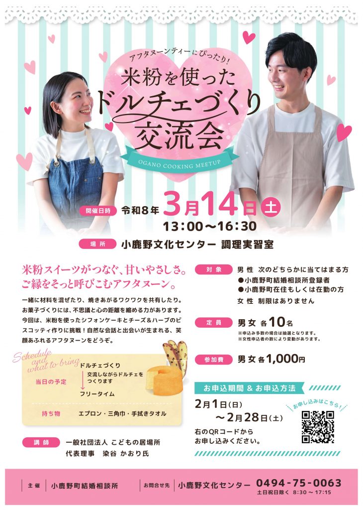 小鹿野文化センターにて、3月14日(土)に「アフタヌーンティーにぴったり!米粉を使ったドルチェづくり交流会」を開催いたします!