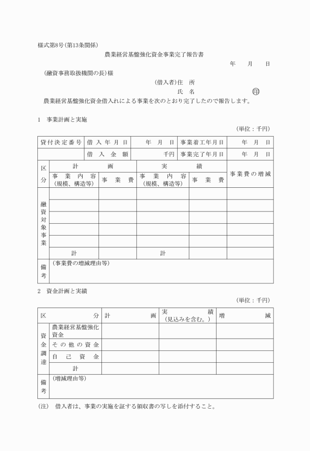 第13条 利子助成を受けた借入者は、当該貸付年度の事業完了後、遅滞なく当該貸付年度に係る事業の農業経営基盤強化資金事業完了報告書(様式第8号)を融資事務取扱機関に2部提出するものとする。