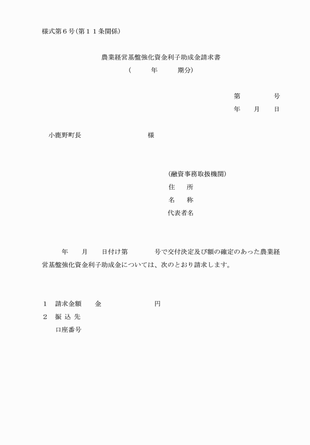第11条 融資事務取扱機関は、利子助成金の交付を請求するときは、農業経営基盤強化資金利子助成金請求書(様式第6号)を町長に提出しなければならない。