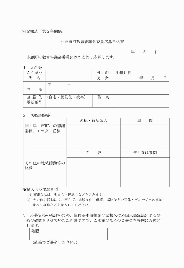 第5条 委員の公募に当たっては、小鹿野町教育審議会委員応募申込書(別記様式)の提出を求めるものとする。