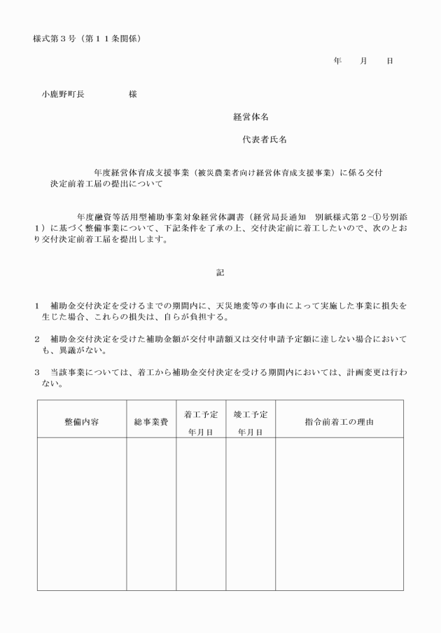 2 補助対象者は、整備事業に着工したときは、速やかにその旨を経営体育成支援事業に係る着工届(様式第4号)により、町長に届け出るものとする。ただし、要綱別記2の第1の4(2)に基づく計画の承認前に整備事業に着工したものにあってはこの限りではない。