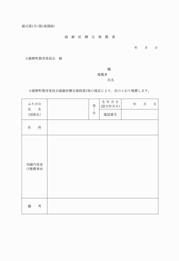 第4条 小鹿野町教育委員会(以下「教育委員会」という。)は、前条の規定により推薦があったときは、内容を審査の上感謝状贈呈の可否を決定する。