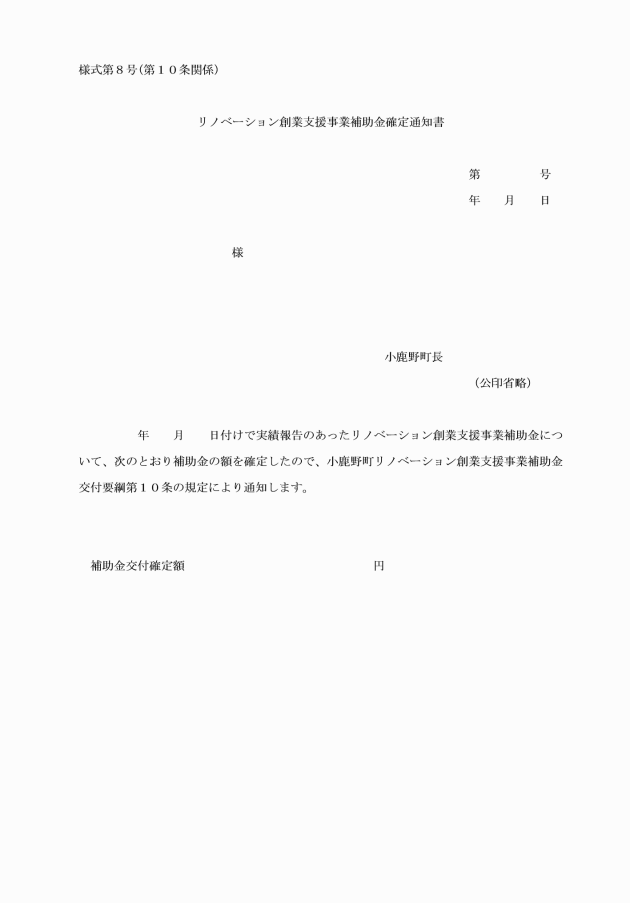 第8条 補助金の交付決定を受けた者(以下「補助決定者」という。)は、当該申請の内容を変更し、又は補助対象事業を中止しようとするときはリノベーション創業支援事業補助金変更・中止承認申請書(様式第4号)を町長に提出しなければならない。