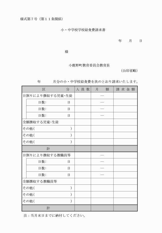 第7条 小・中学校の長は、当月において学校給食の提供を受けた当該小・中学校の児童生徒又は教職員等の人員(以下「学校給食受給人員」という。)を学校給食受給人員報告書(様式第4号)により、当月末日までに教育委員会に報告しなければならない。